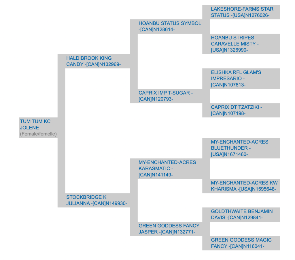 Tum Tum KC Jolene EX90 3 yo 3rd lactation 3 yo, 3rd lactation Yearling 1st lactation Dam’s udder, 1st lactation, 2yo Sire: Haldibrook King Candy Share this: Click to share on X (Opens in new window) X Click to share on Facebook (Opens in new window) Facebook Like Loading...